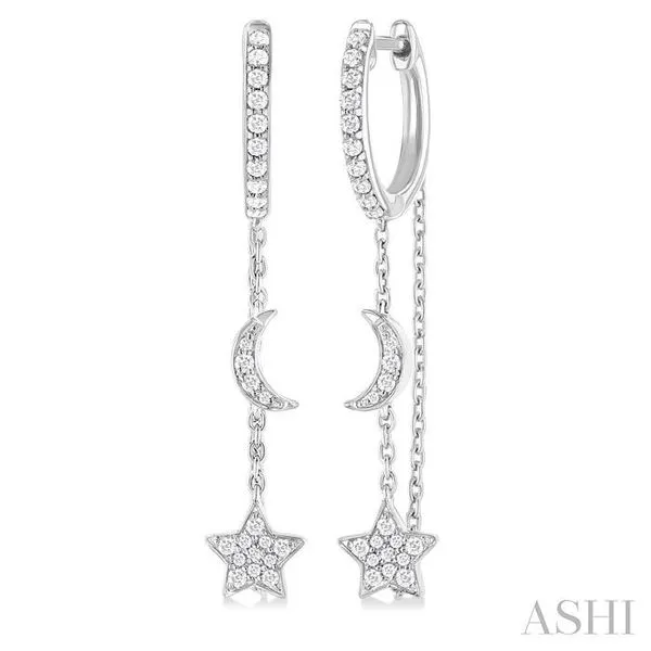 (256) 764-40131/3 Ctw Crescent Moon & Star Round Cut Diamond Chain Dangler Hoop Earring in 10K White Gold