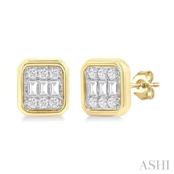 (256) 764-40131/5 Ctw Petite Bezel Set Emerald Shape Fusion Baguette and Round Cut Diamond Fashion Stud Earring in 10K Yellow Gold