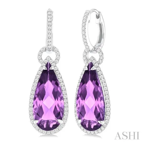 (256) 764-401318X8 MM Pear Cut Amethyst and 5/8 Ctw Round Cut Diamond Halo Semi-Precious Earrings in 14K White Gold