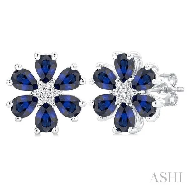 (256) 764-40134X3 MM Floral Blossom Pear Cut Sapphire and 1/20 Ctw Round Cut Diamond Precious Stud Earring in 14K White Gold