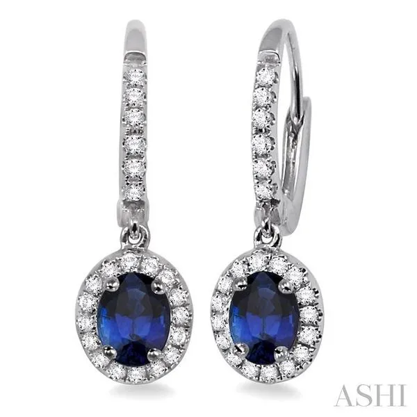 (256) 764-40135x3 MM Oval Cut Sapphire and 1/4 Ctw Round Cut Diamond Earrings in 14K White Gold