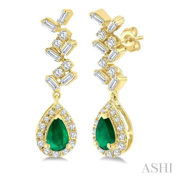 (256) 764-40135x3 MM Pear Shape Emerald, 1/3 Ctw Baguette and Single Cut Diamond Halo Precious Earrings in 10K Yellow Gold