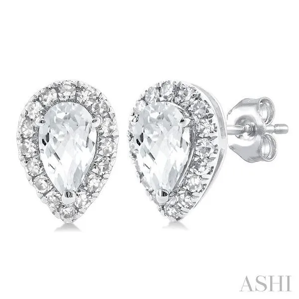 (256) 764-40135x3 MM Pear Shape White Topaz and 1/8 Ctw Single Cut Diamond Halo Semi-Precious Stud Earrings in 14K White Gold