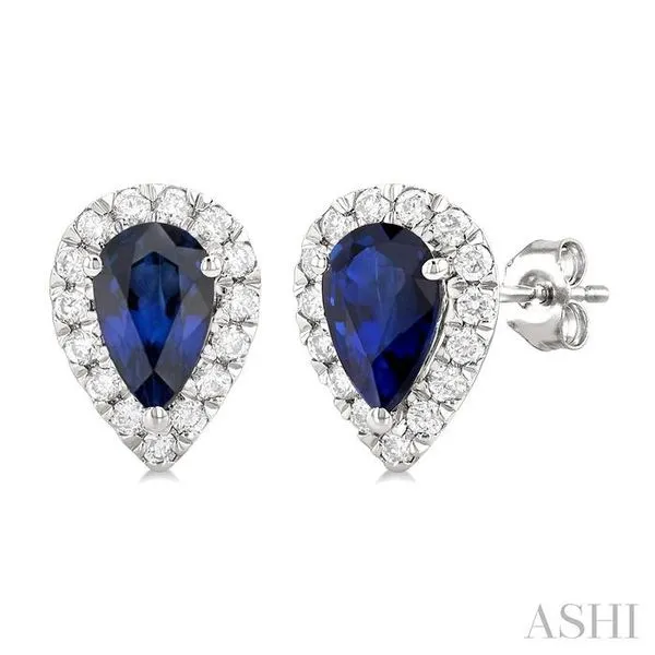 (256) 764-40136x4 MM Pear Shape Sapphire and 1/4 Ctw Round Cut Diamond Halo Precious Stud Earrings in 14K White Gold