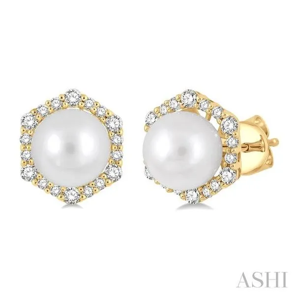 (256) 764-40137 MM Cultured Pearls and 1/3 Ctw Hexagon Shape Round Cut Diamond Earrings in 14K Yellow Gold