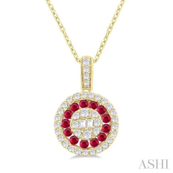(256) 764-40131.35 MM Round Shape Ruby and 1/4 Ctw Baguette and Round Cut Diamond Precious Pendant With Chain in 14K Yellow Gold