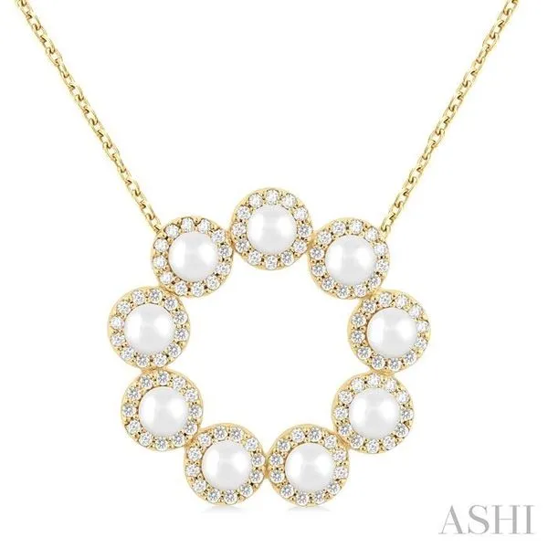 (256) 764-40133 MM Round Shape Cultured Pearl and 1/3 Ctw Round Cut Diamond Circle Halo Pendant With Chain in 14K Yellow Gold