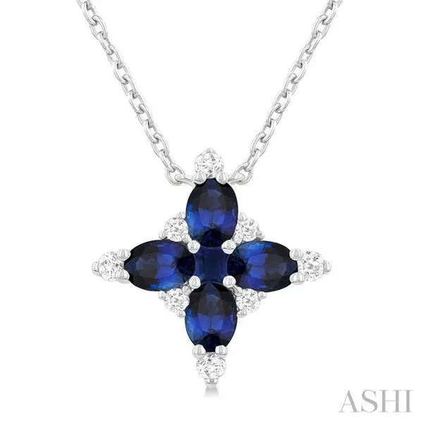 (256) 764-40134x3 MM Oval Cut & 2 MM Princess Cut Sapphire and 1/10 Ctw Round Cut Diamond Floral Design Pendant With Chain in 14K White Gold