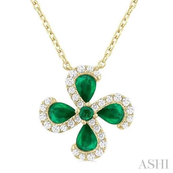 (256) 764-40134x3 MM Pear Cut & 2 MM Round Cut Emerald and 1/6 Ctw Round Cut Diamond Floral Shape Pendant With Chain in 14K Yellow Gold