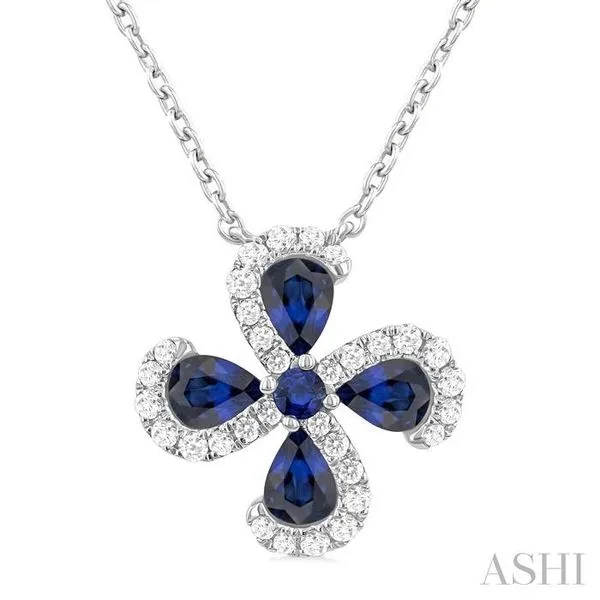 (256) 764-40134x3 MM Pear Cut & 2 MM Round Cut Sapphire and 1/6 Ctw Round Cut Diamond Floral Shape Pendant With Chain in 14K White Gold