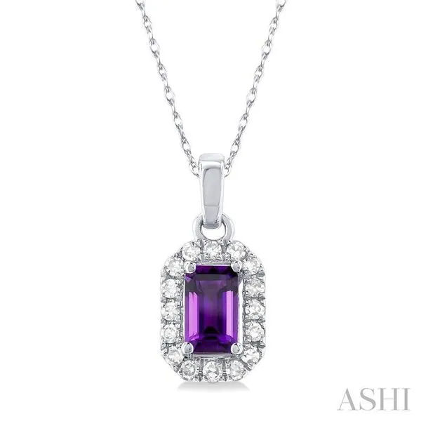 (256) 764-40135x3 MM Octagonal Shape Amethyst and 1/20 Ctw Single Cut Diamond Halo Semi-Precious Pendant with Chain in 14K White Gold