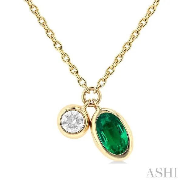 (256) 764-40135x3 MM Oval Cut Emerald and 1/50 Ctw Bezel Set Round Cut Diamond Precious Pendant With Chain in 10K Yellow Gold