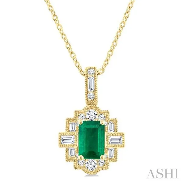 (256) 764-40136X4 MM Octagon Shape Emerald and 1/4 Ctw Round and Baguette Cut Diamond Precious Pendant With Chain in 14K Yellow Gold