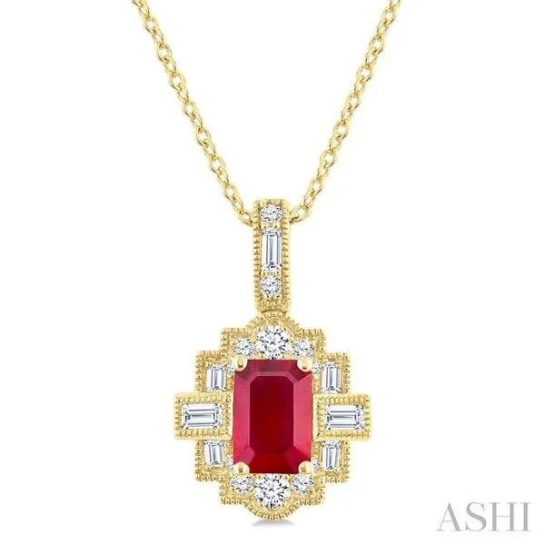 (256) 764-40136X4 MM Octagon Shape Ruby and 1/4 Ctw Round and Baguette Cut Diamond Precious Pendant With Chain in 14K Yellow Gold