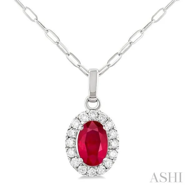 (256) 764-40136x4 MM Oval Shape Ruby and 1/6 Ctw Round Cut Diamond Halo Precious Pendant with Chain in 14K White Gold