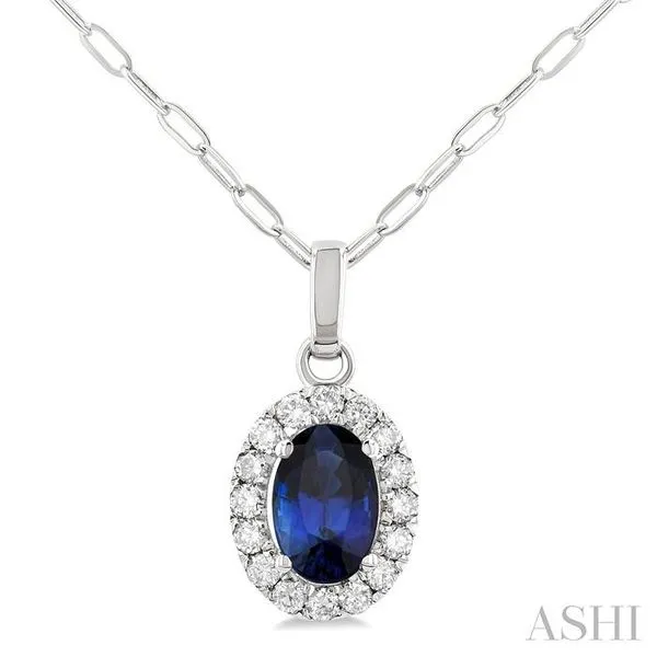 (256) 764-40136x4 MM Oval Shape Sapphire and 1/6 Ctw Round Cut Diamond Halo Precious Pendant with Chain in 14K White Gold
