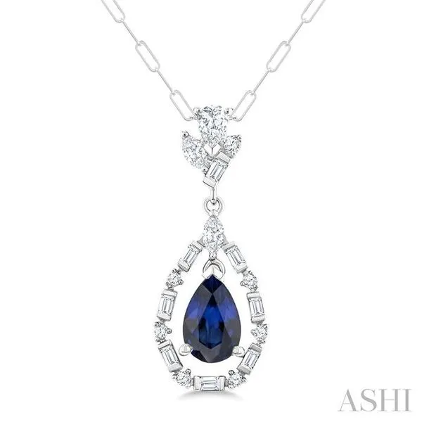 (256) 764-40137x5 MM Pear Shape Sapphire and 1/3 Ctw Mixed Cut Diamond Precious Dangle Pendant With Chain in 14K White Gold