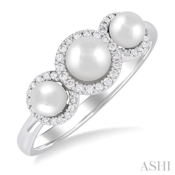 (256) 764-40131/6 Ctw Past, Present & Future 4MM & 5MM Cultured Pearl and Round Cut Diamond Halo Ring in 14K White Gold