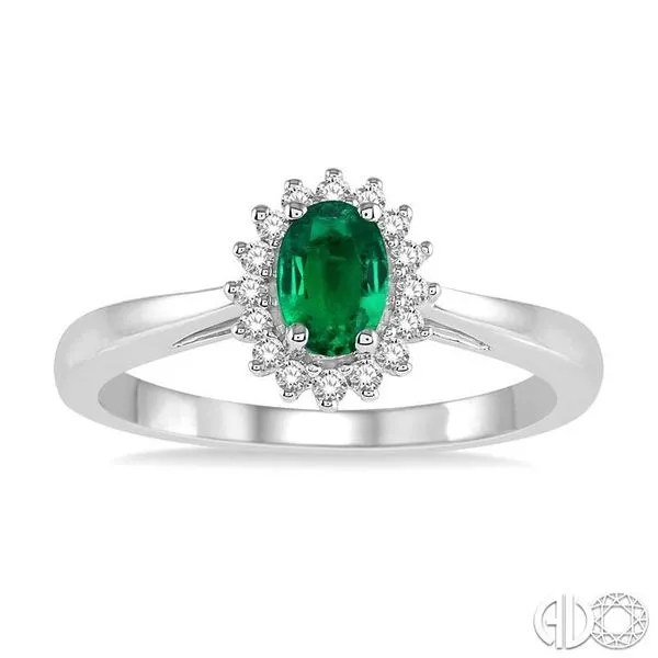 (256) 764-40136X4 MM Oval Cut Emerald Center and 1/8 Ctw Round Cut Diamond Halo Precious Stone Ring in 10K White Gold
