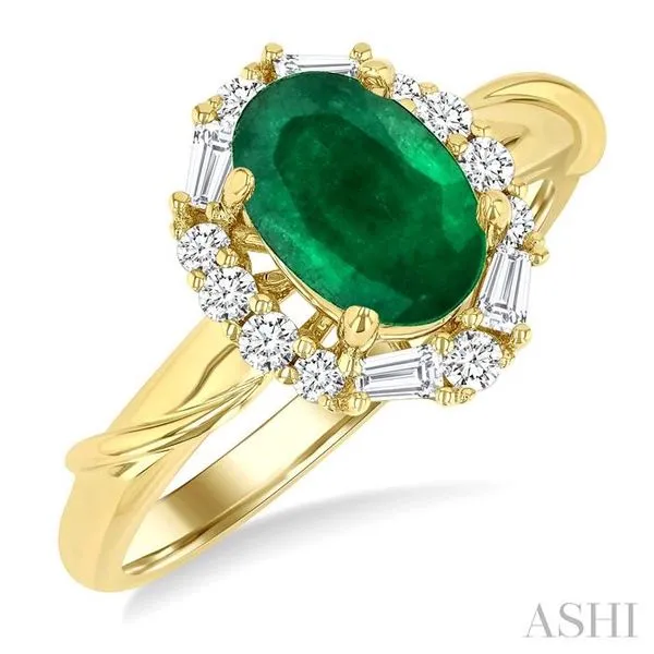 (256) 764-40137x5 MM Oval Cut Emerald and 1/3 Ctw Baguette and Round Cut Diamond Halo Precious Ring in 14K Yellow Gold